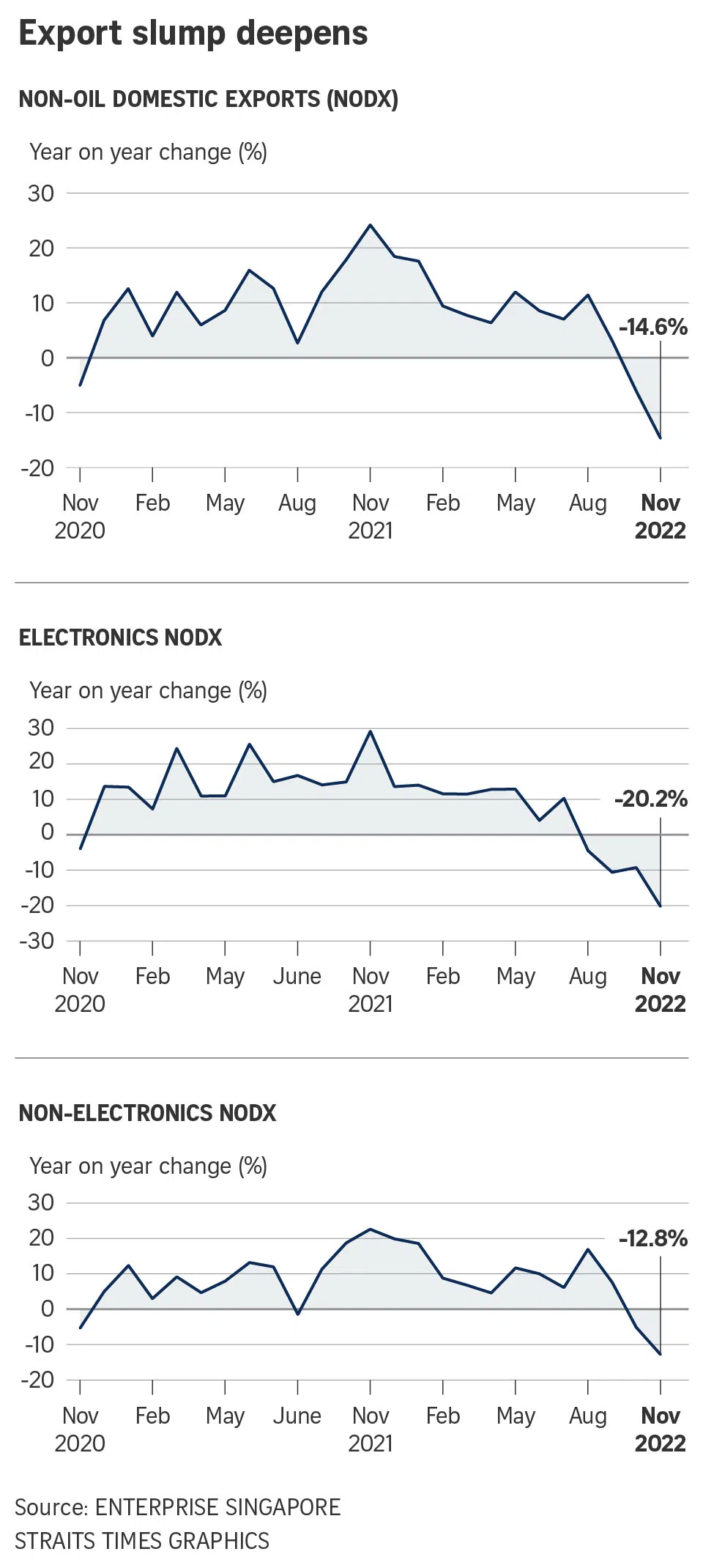 Non-oil domestic exports (Nodx) shrank 14.6 per cent year on year in November, from a high base a year earlier, Enterprise Singapore noted. This was the second straight monthly contraction after nearly two years of growth.