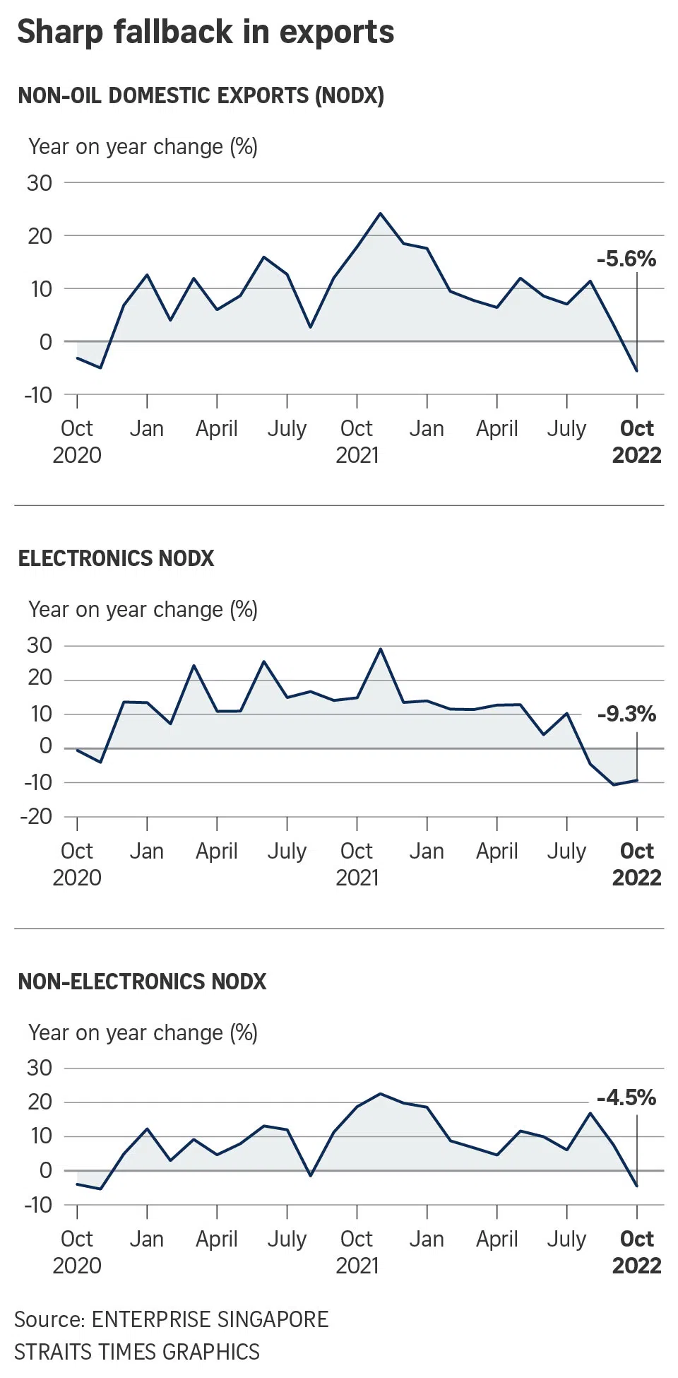 Non-oil domestic exports (Nodx) shrank 5.6 per cent year on year last month, reversing September’s 3.1 per cent growth, data from Enterprise Singapore (EnterpriseSG) showed on Thursday.