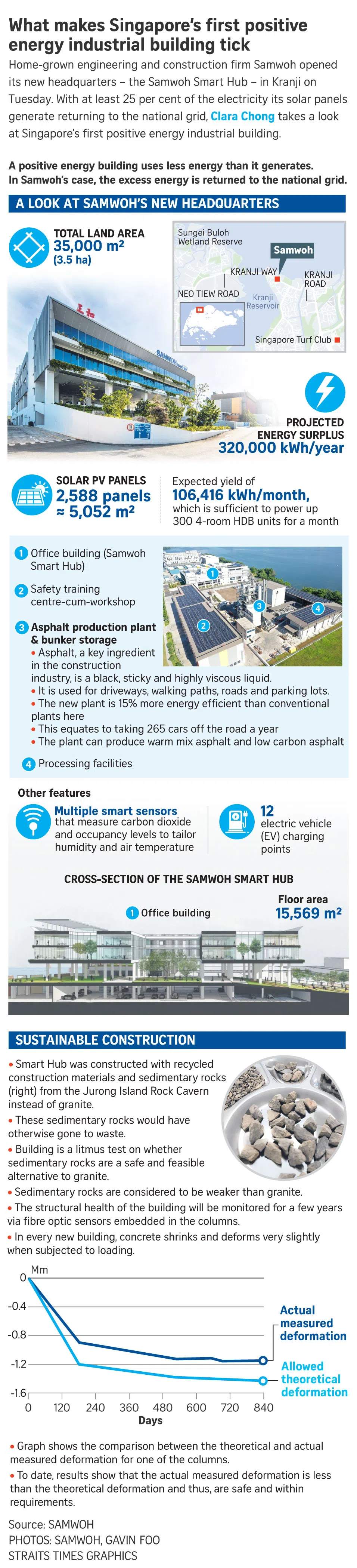 SINGAPORE - Home-grown engineering and construction firm Samwoh opened its new headquarters in Kranji on Tuesday, featuring the nation’s first positive-energy industrial building.