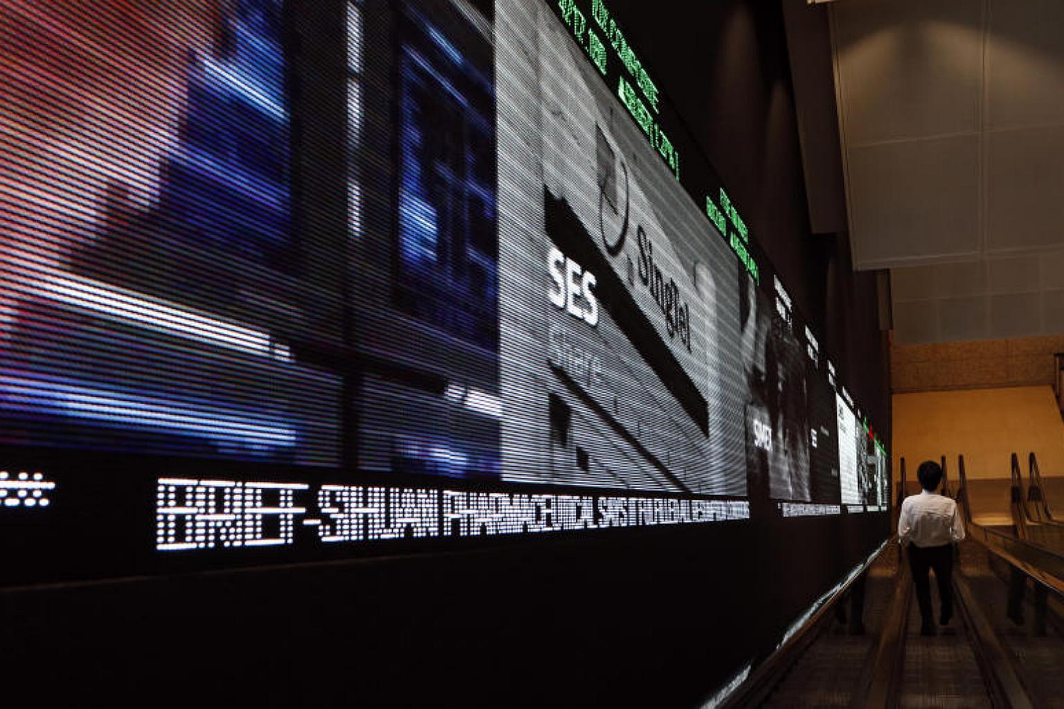 A man walking down the escalator next to the big screen at the Singapore Exchange (SGX).