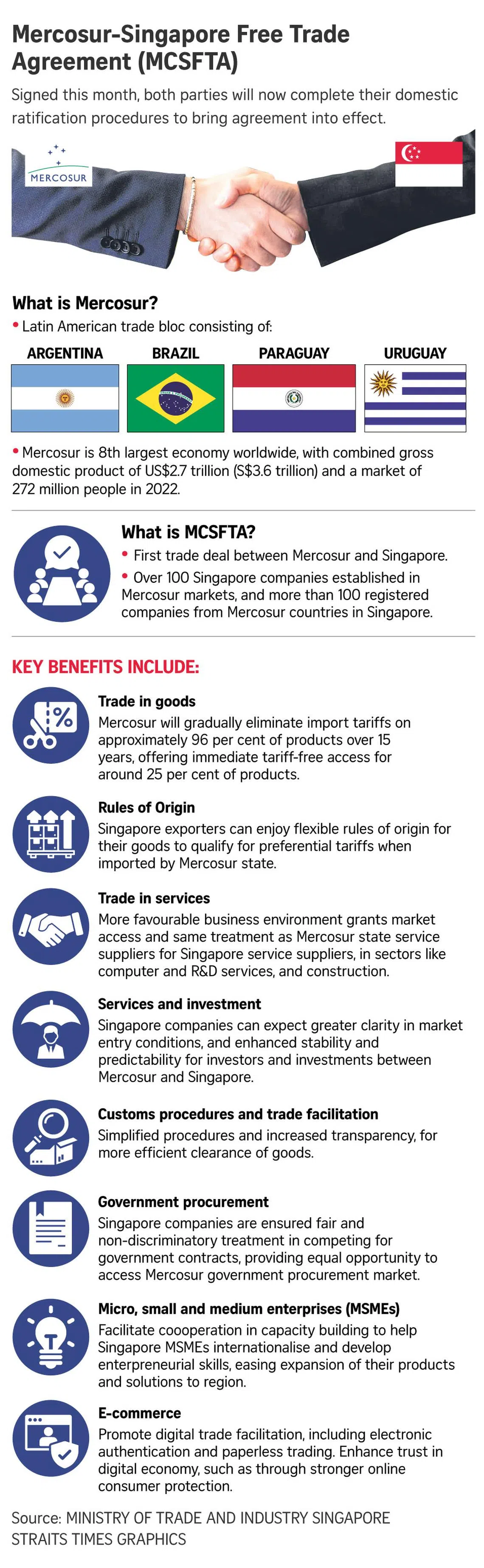 The deal with Argentina, Brazil, Paraguay and Uruguay – a group known by the Spanish acronym Mercosur – is Singapore’s first trade pact with these states and the bloc’s first such deal with a South-east Asian nation.