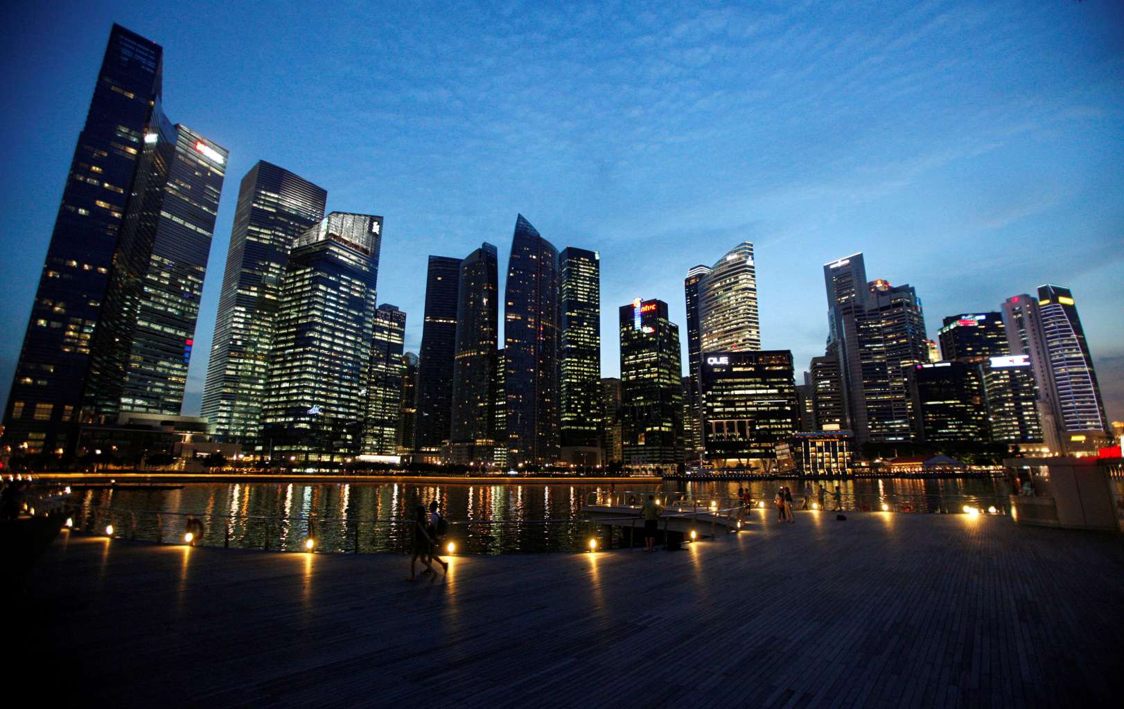 People walk past the skyline of Marina Bay central business district in Singapore April 26, 2013.