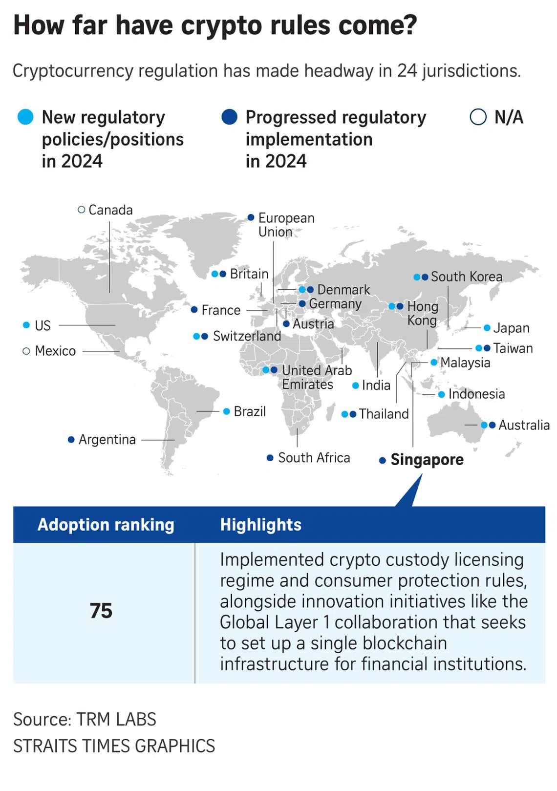 TRM Labs reviewed 2024 crypto policy developments in 24 jurisdictions including Singapore, the United States and Europe, representing about 70 per cent of global crypto exposure. It found that more than 60 per cent of jurisdictions introduced new policies or rules for digital assets, and about 70 per cent made progress in implementing regulations.