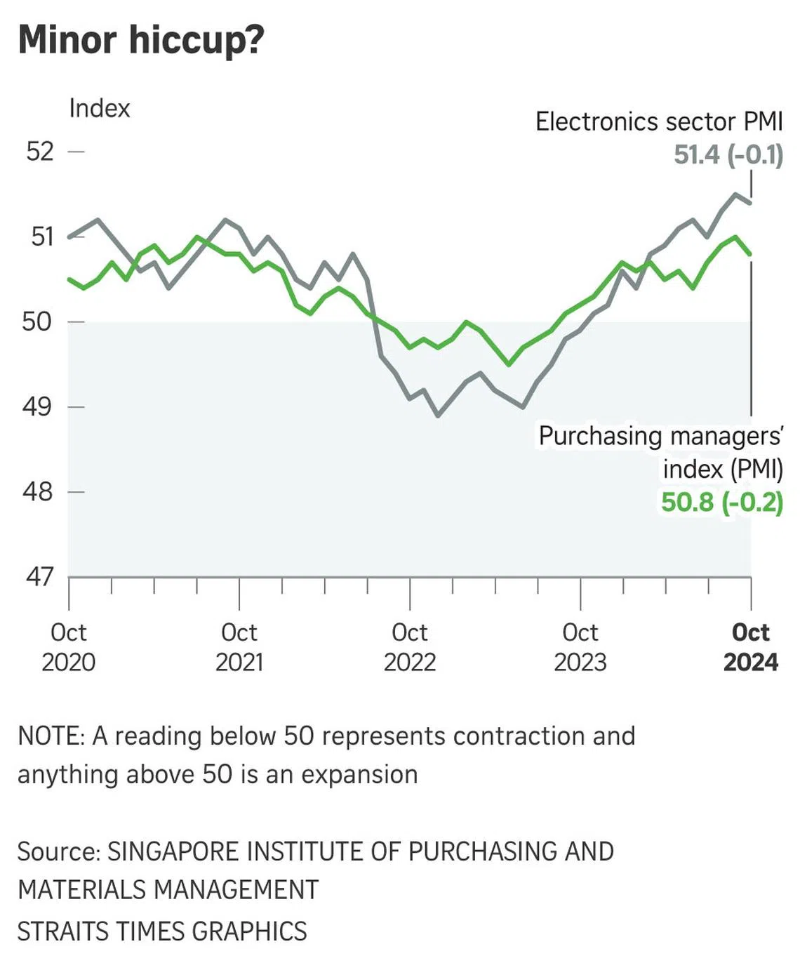 Electronics remains a crucial driver of economic growth, despite its PMI also posting a slight drop to 51.4 points, from 51.5 points in September, according to data released by the Singapore Institute of Purchasing and Materials Management on Nov 2.