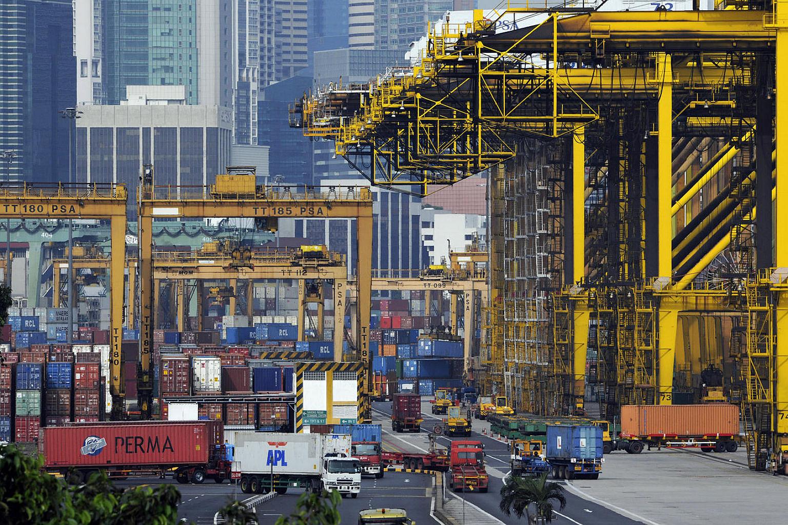 Shipping containers are moved and stacked at a port in Singapore.