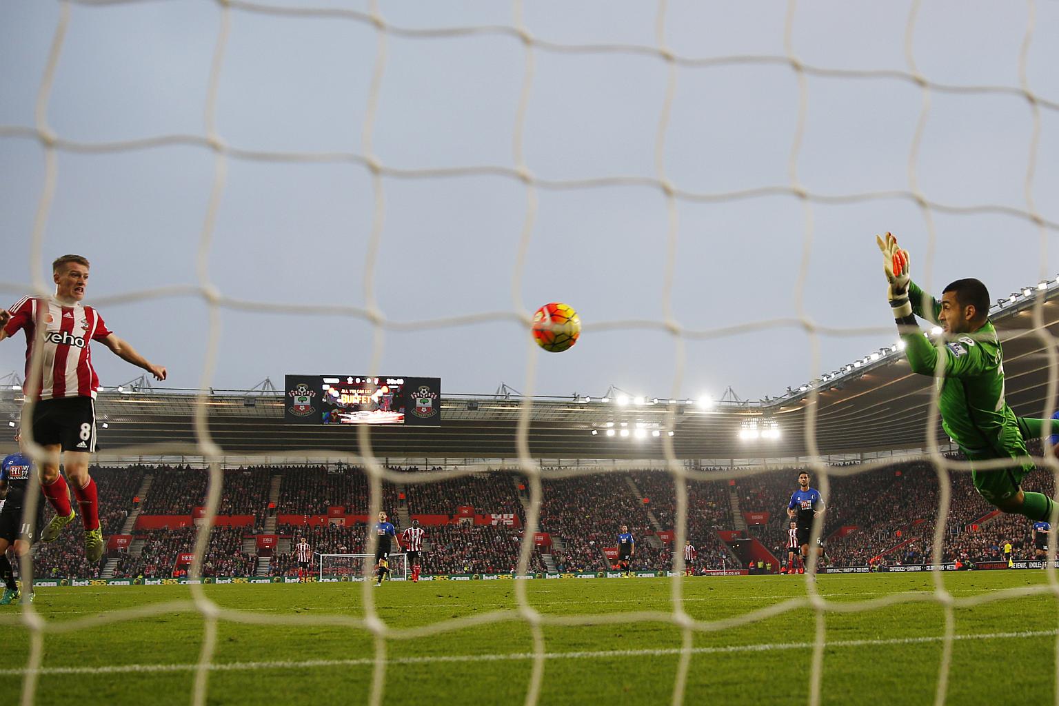 Southampton's Steven Davis scores the first goal against AFC Bournemouth in the Barclays Premier League match at St Mary's Stadium on Nov 1, 2015.