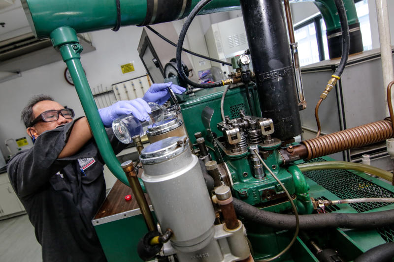 Techinical supervisor Abdul Razak Amat testing and checking on vehicle oil at Singapore Accreditation Council-accredited certification body Bureau Veritas.