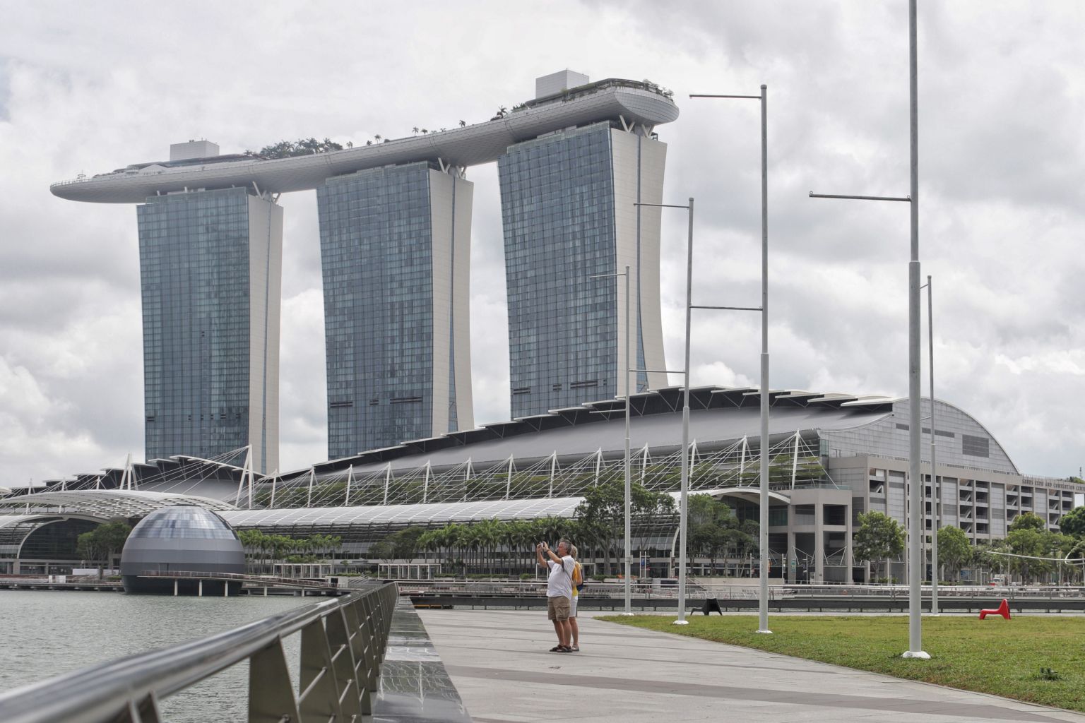 Tourists take pictures of the Singapore skyline from Marina Bay on Feb 13, 2020.