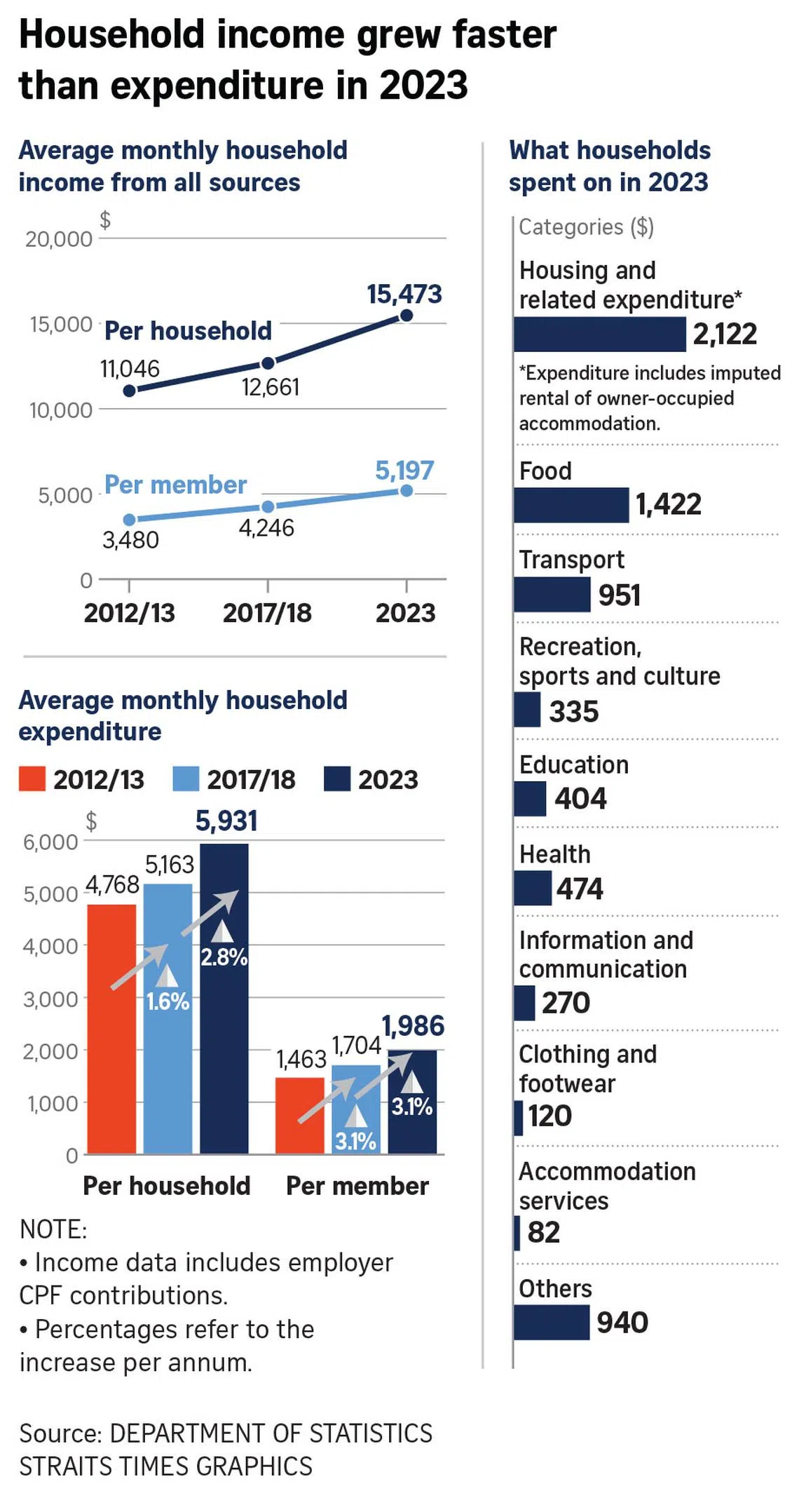 The Household Expenditure Survey 2023 found that the average monthly household income in Singapore rose by 4.1 per cent a year between 2017/18 and 2023, from $12,661 to $15,473.