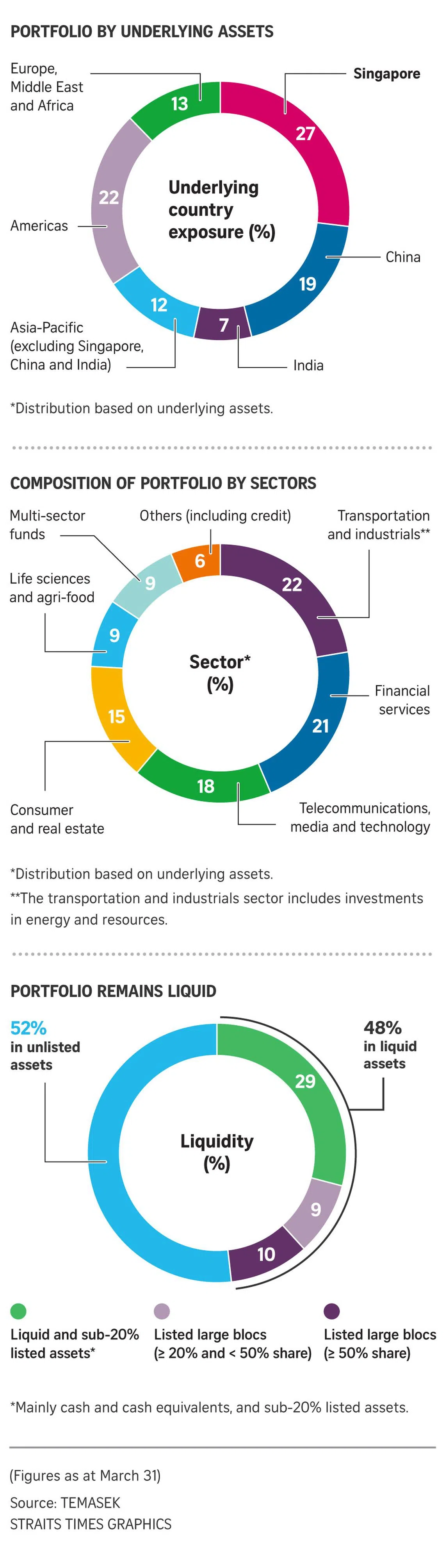 About a third of Temasek’s unlisted portfolio – 31 per cent – is in Singapore companies such as PSA, SP Group and Mapletree.