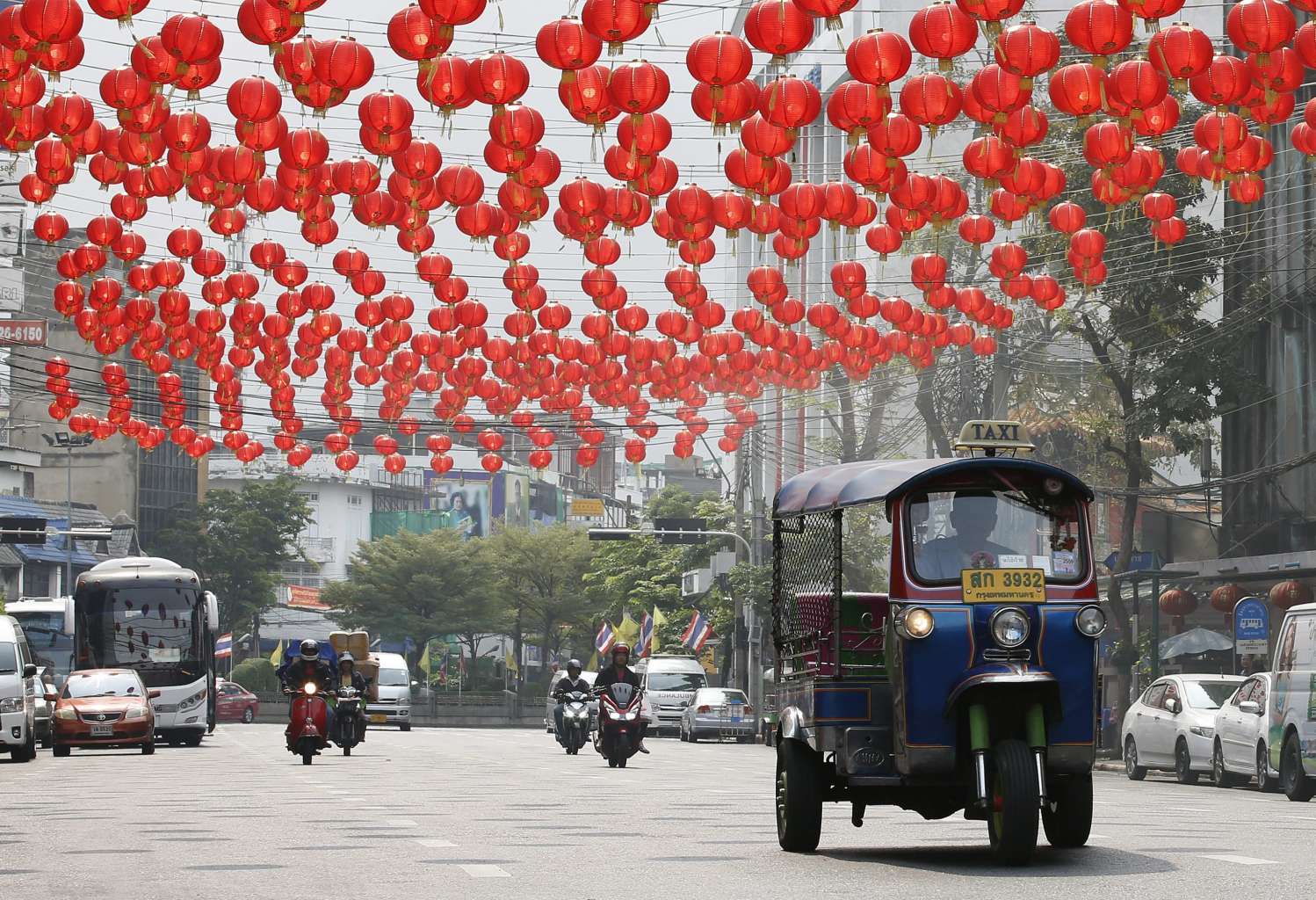 A Tuk Tuk, three wheeler taxi drives past under Lunar New Year banners on the eve of Chinese Lunar New Year in Bangkok's Chinatown, Thailand. PHOTO: EPA