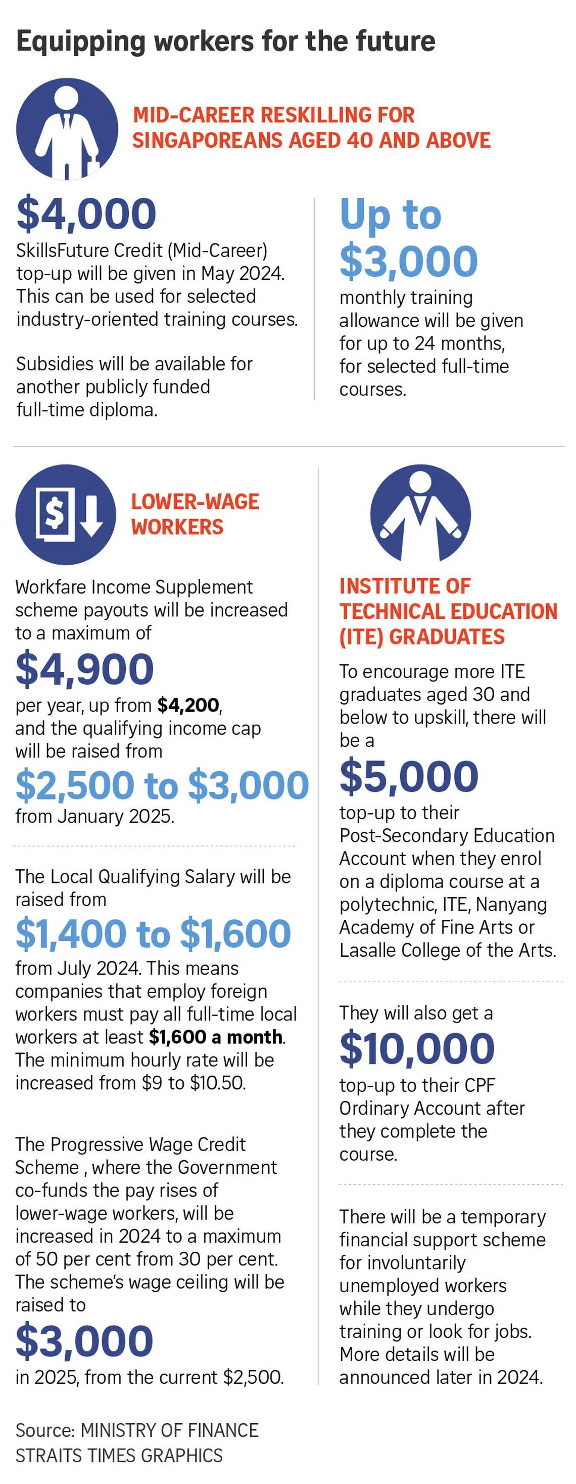 In addition, Singaporeans aged 40 and above who enrol on a full-time course will receive a monthly training allowance of up to half their last-drawn pay, capped at $3,000, for up to 24 months when they pursue certain full-time courses.