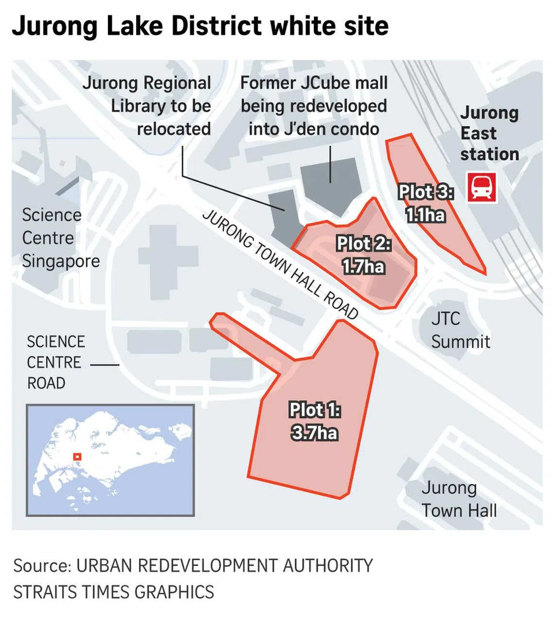 If sold, the white site, which links the existing commercial centre at Jurong East MRT interchange station and the future Jurong Lake District station of the Cross Island Line, will be the second master developer site to be developed in phases, following a 3.55ha site in the Marina Bay Financial Centre sold in 2005.