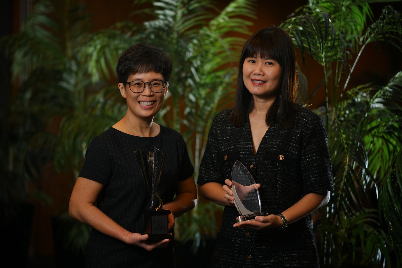 ST senior business correspondents Chor Khieng Yuit (left) and Joyce Lim win the Investor Education Journalist of the Year and Special Award respectively.
