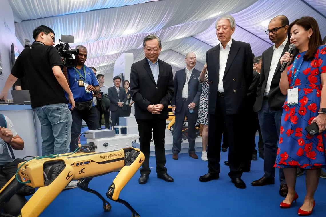 Guests at the Punggol Digital District showcase on April 18 include (from centre left) Trade and Industry Minister Gan Kim Yong, Senior Minister Teo Chee Hean and Senior Minister of State Janil Puthucheary.