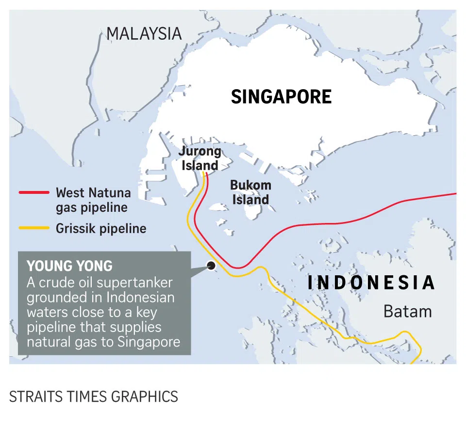 The supertanker Young Yong ran aground near a critical gas pipeline that supplies gas to Singapore.