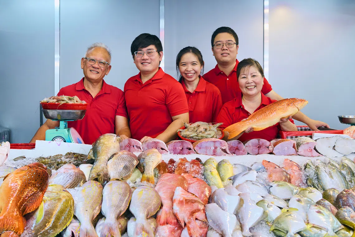 The Goh family, including Jimmy (second from left), rallied around father Goh Thiam Chwee’s vision to transform their declining wet market fish stall, seeking help from Enterprise Singapore after seeing sales decline 20 per cent over three years.