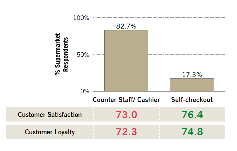 Findings by the CSISG study regarding customer satisfaction levels towards this new introduction should alleviate those concerns. The data indicated that self-service resulted in more satisfied customers: Supermarket shoppers who used the self-checkout machines gave an average satisfaction score of 76.4 points, while those who checked out through the cashier averaged a substantially lower 73.0 points.