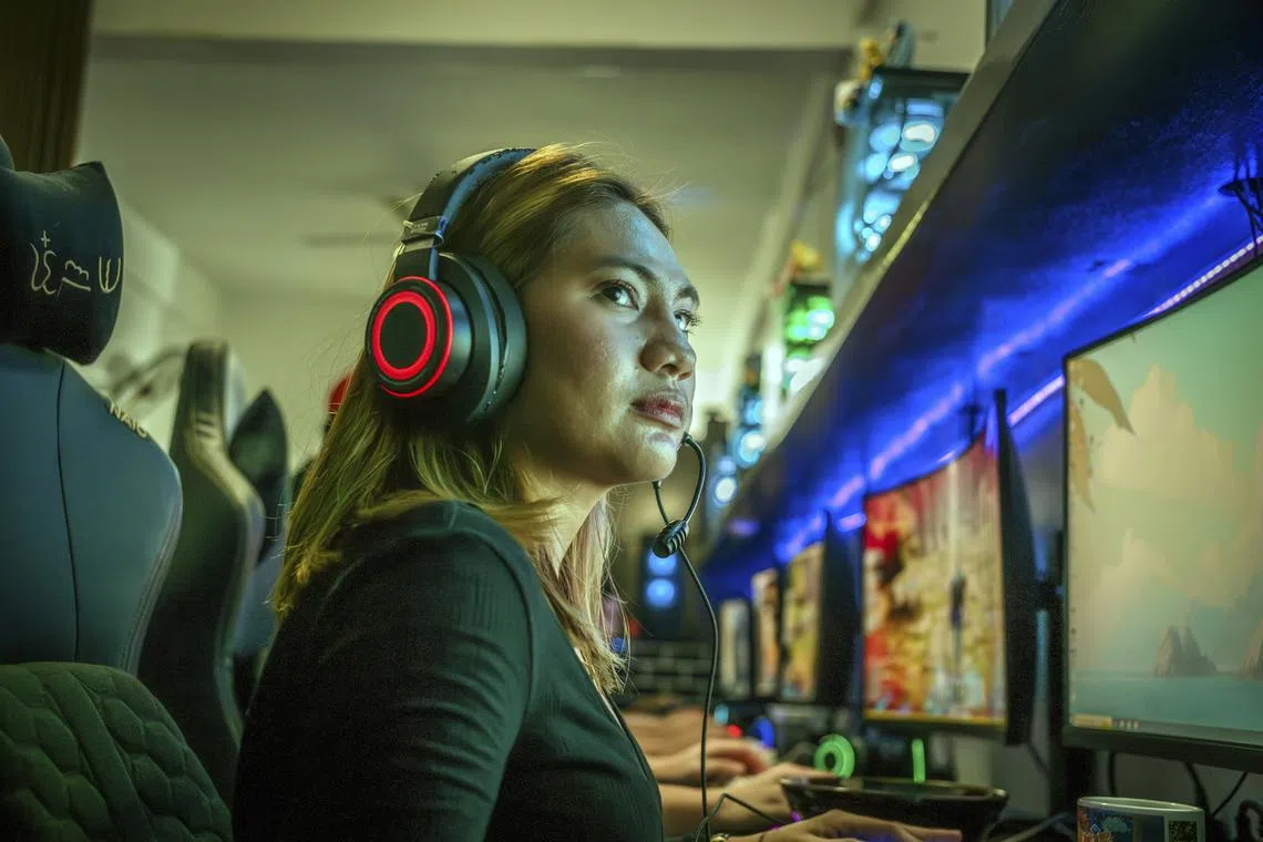 Seated at computers with 34-inch curved monitors, they began playing video games such as Heroes Of Mavia and Nifty Island, as music from Taylor Swift and Maroon 5 hummed from the speakers.