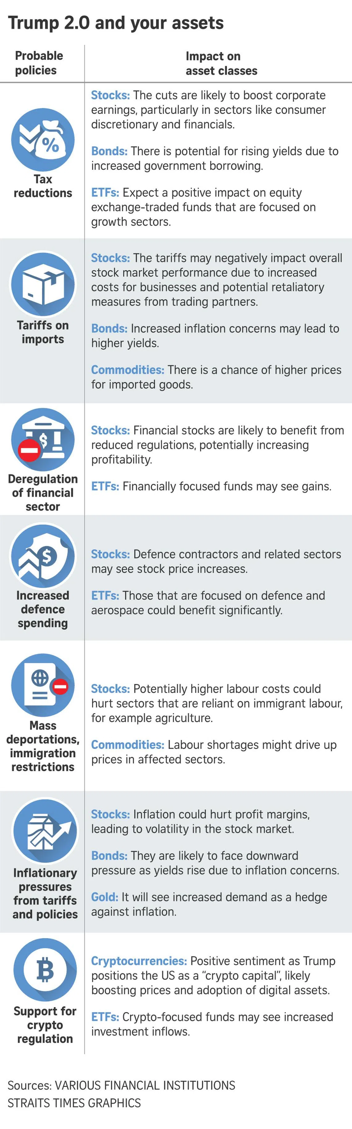 Endowus chief investment advisory officer Hugh Chung noted: “A second Trump presidency may lead to higher inflation, interest rates and a stronger US dollar due to higher tariffs. It may also mean stronger corporate earnings due to tax cuts.”