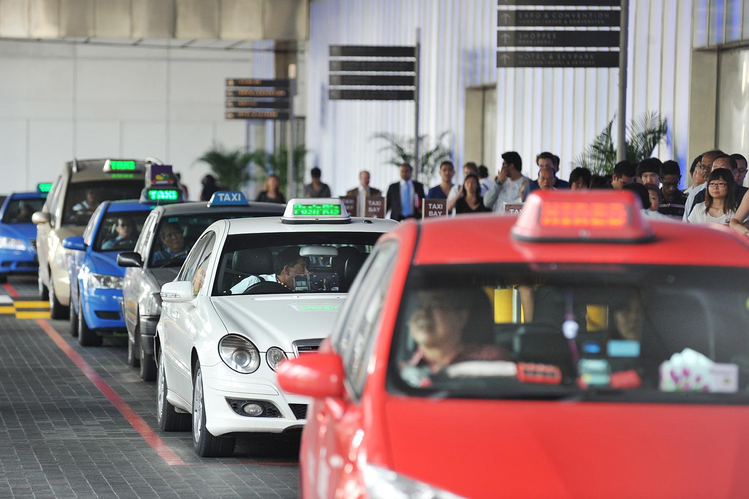 Taxis picking up passengers waiting in line at The Shoppes at Marina Bay Sands.
