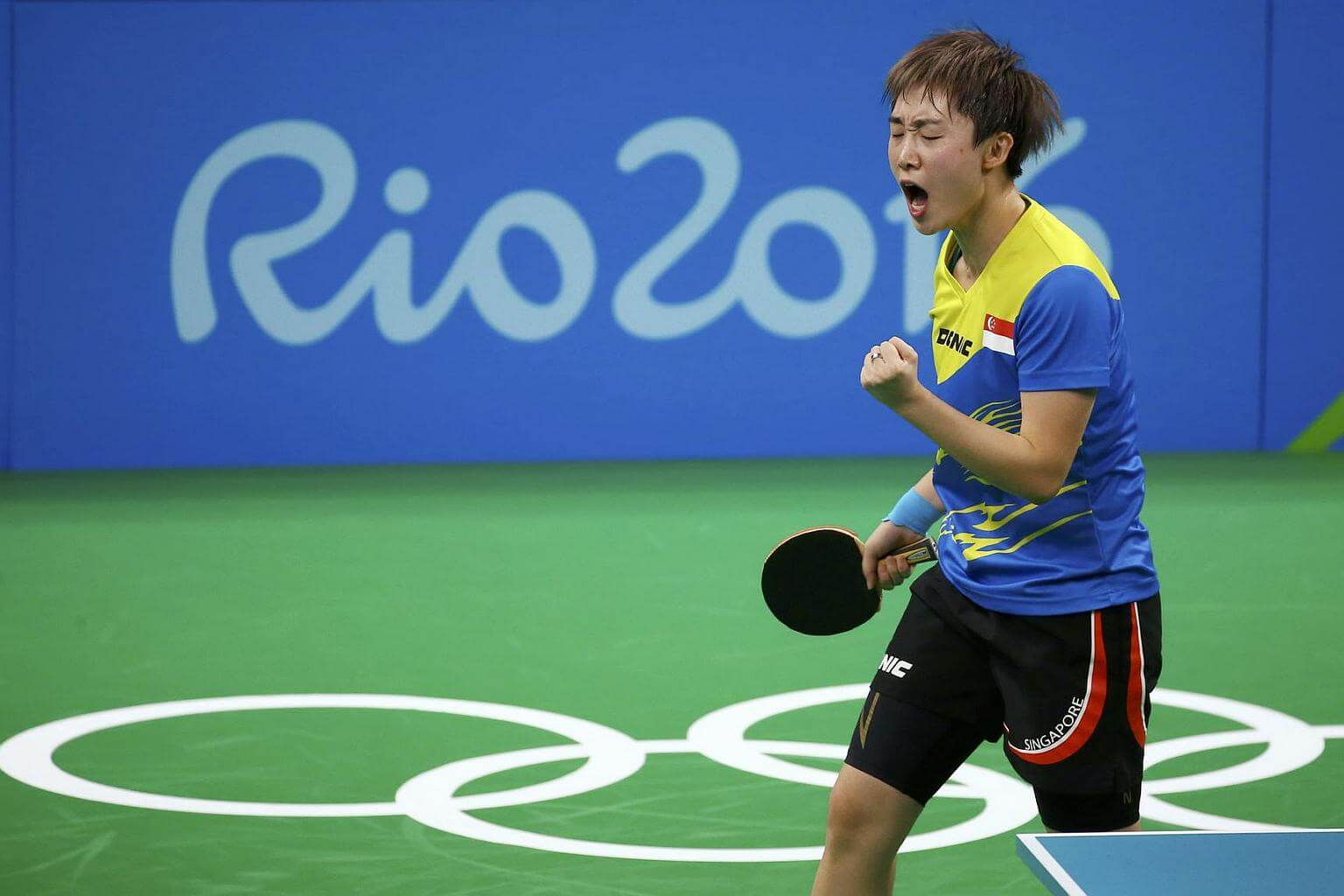 Feng Tianwei of Singapore celebrates after winning her match against Xialian Ni of Luxembourg.