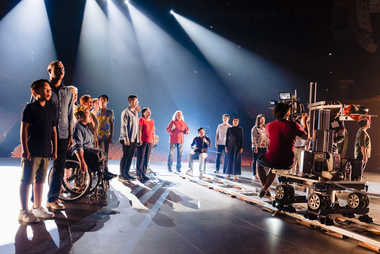 Veteran singer-songwriter Ramli Sarip (centre in red) sings in the new music video to mark Majulah Singapura's 60th anniversary.