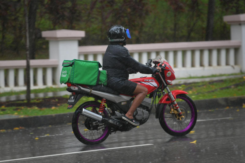 A Grab food delivery rider is seen riding in the rain along Ang Mo Kio Avenue 3, on Dec 18, 2019.