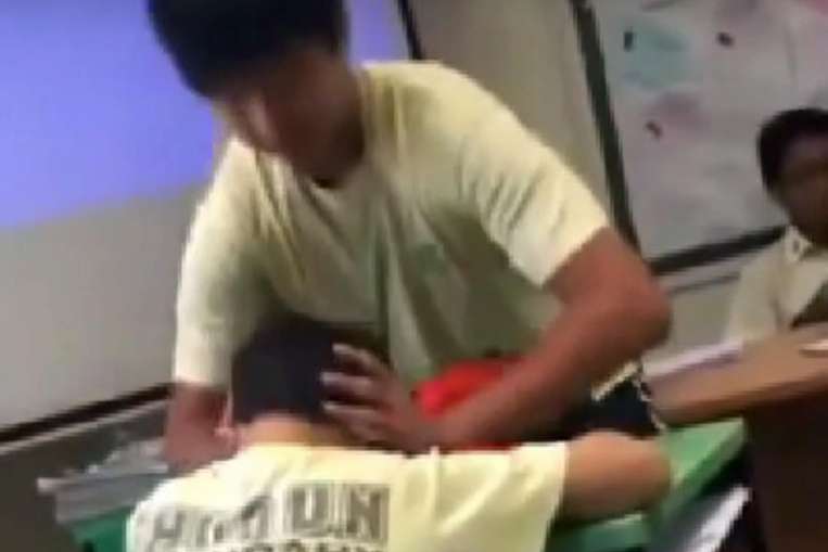 A boy is seen hitting another in this still from a video clip posted online.