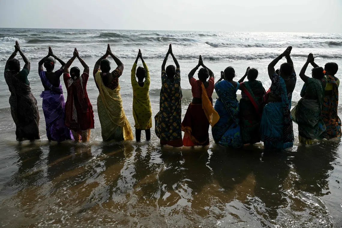 Women gathering to pray for the victims of the 2004 Indian Ocean tsunami during a ceremony at Pattinapakkam beach in Chennai, India, on Dec 26, 2025.