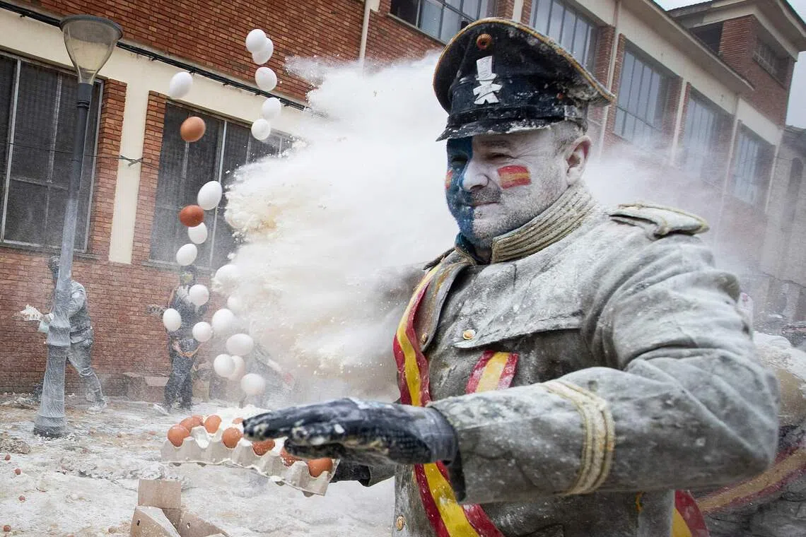 Revellers in mock military garb pelting one another with flour and eggs in the south-eastern Spanish town of Ibi on Dec 28, 2025. In this 200-year-old traditional winter festival, the participants – known as Els Enfarinats (those covered in flour) – dress in military clothes and stage a mock coup d’etat as they battle using flour, eggs and firecrackers outside the town.