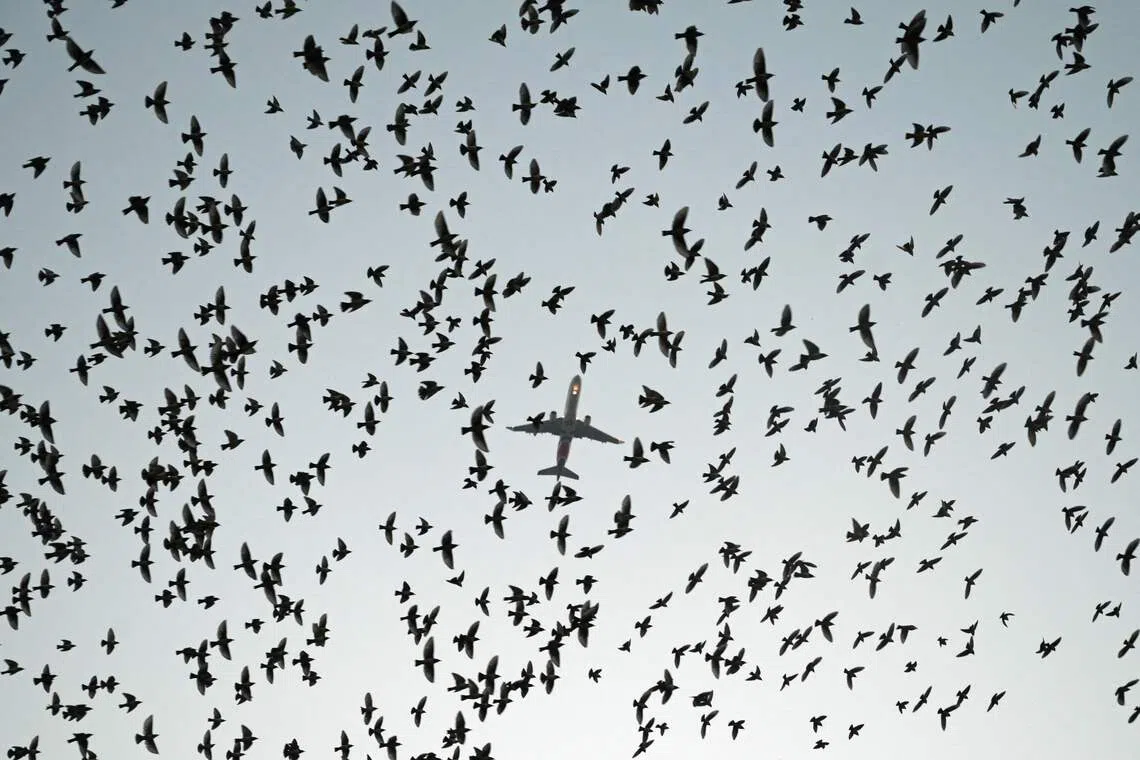 An aircraft soaring above the birds in the evening sky above Ahmedabad, India, on Dec 28, 2025.