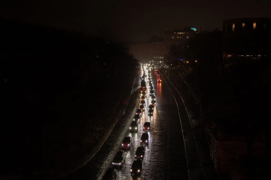 Vehicles with their headlights on driving down a non-illuminated road during a power outage in Kyiv, Ukraine, on Dec 27, 2025, following Russian missile and drone attacks on Ukrainian energy infrastructure.