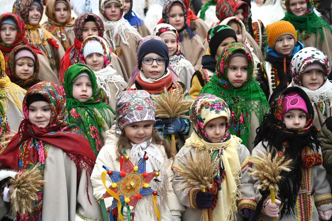 Children wearing traditional clothes and carrying traditional Christmas decorations taking part in a Christmas Eve procession in Lviv, Ukraine, on Dec 24, 2025, amid the Russian invasion of Ukraine.