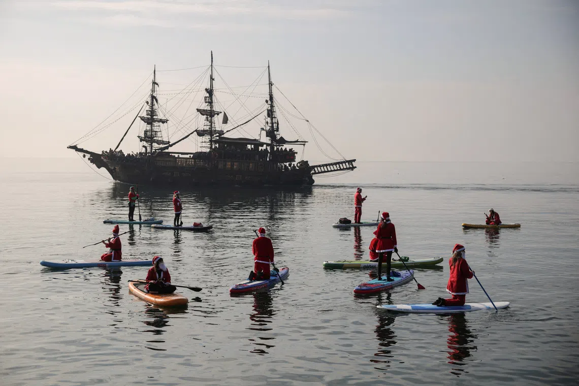 Paddleboarders in Santa costumes off the seafront of Thessaloniki, Greece, on Dec 21.
