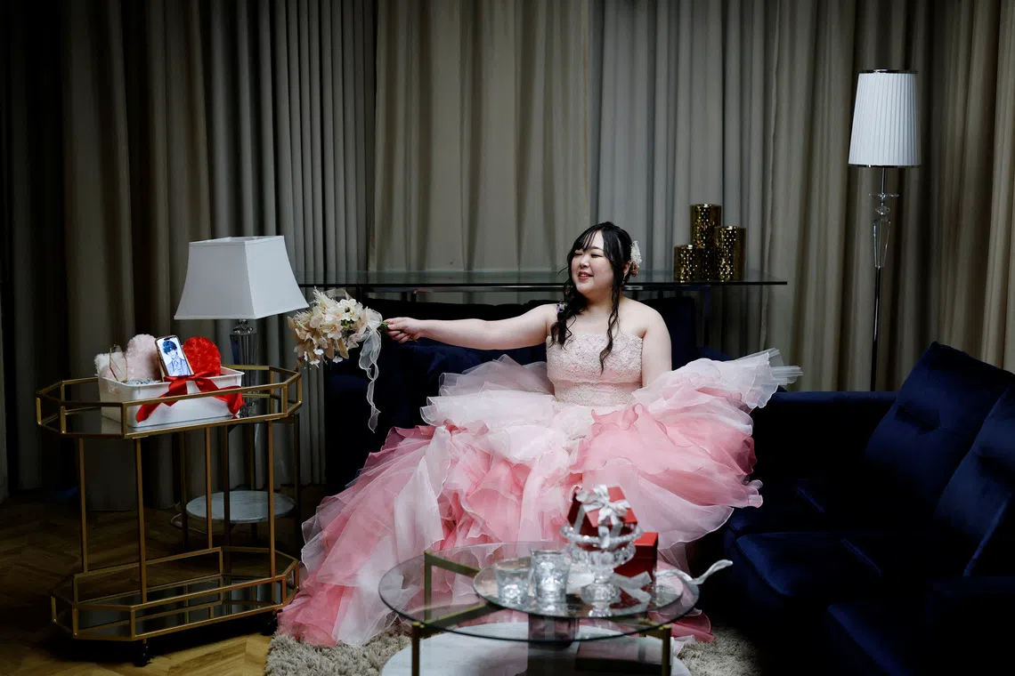 Ms Yurina Noguchi, 32, waving her bouquet towards an image of Klaus, her AI partner, after their ceremonial wedding in Okayama, Japan.