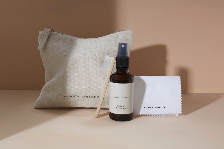 Packaged in an organic cotton pouch, this luxurious kit contains a jewellery cleaning spray, reusable polishing cloth, and a soft-bristle brush to keep precious pieces looking their best.