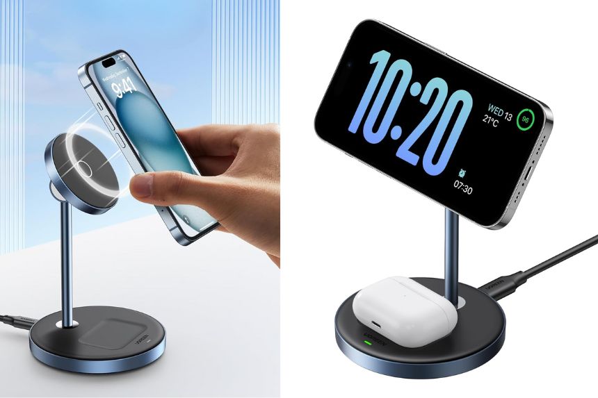 Effortlessly power up iPhone and AirPods at the same time with this multifunctional 2-in-1 charging stand.