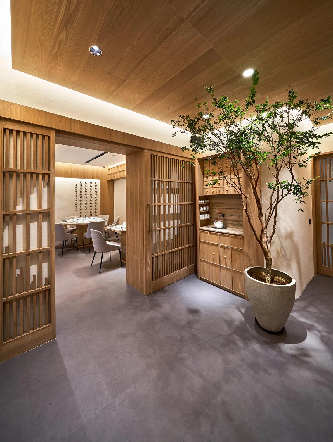 On one wall is a circular faux window to suggest a view of a bigger garden beyond. On the opposite wall is another sliding timber screen that opens to reveal an actual moon gate, which frames the entrances to a more exclusive zone – the private dining room.