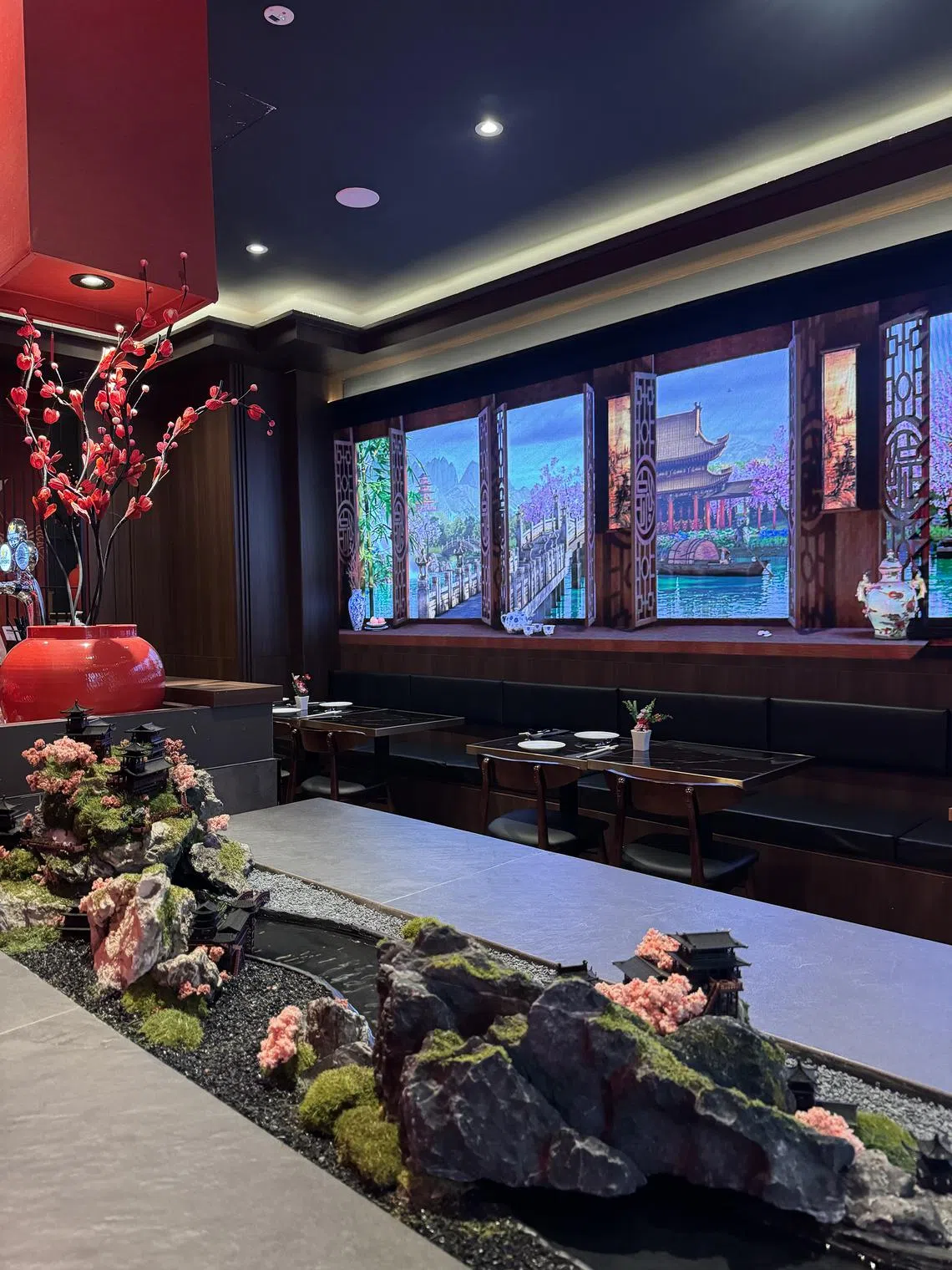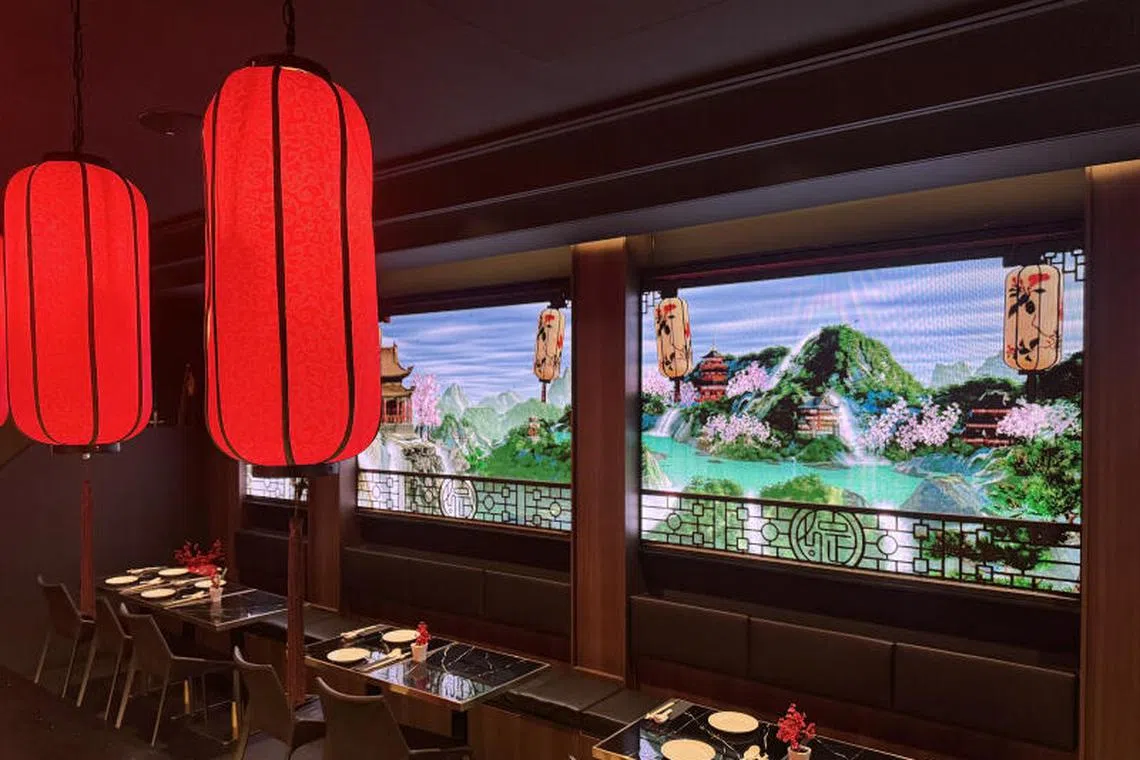 Here, traditional design elements are presented in a different way. Two LED screens dominate the restaurant and bar. They play videos of digital illustrations of traditional Chinese architecture set in picturesque landscapes, and these change with the time of day.