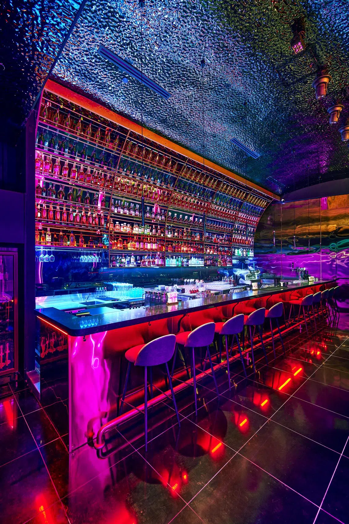 The bar delivers further drama with its high vaulted ceiling, clad in metal sheeting with an embossed ripple effect. Spirits are displayed in a rack that follows the curve of the ceiling, with bottles looking like they are about to fall out.