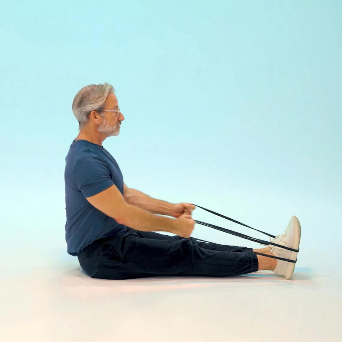 Sit with your legs extended. Wrap the band around your feet and hold one end in each hand. Sit tall, with your core engaged and your shoulders back. Pull the band back to your waist and release in a rowing motion. If it is difficult to keep your legs straight, bend your knees slightly.