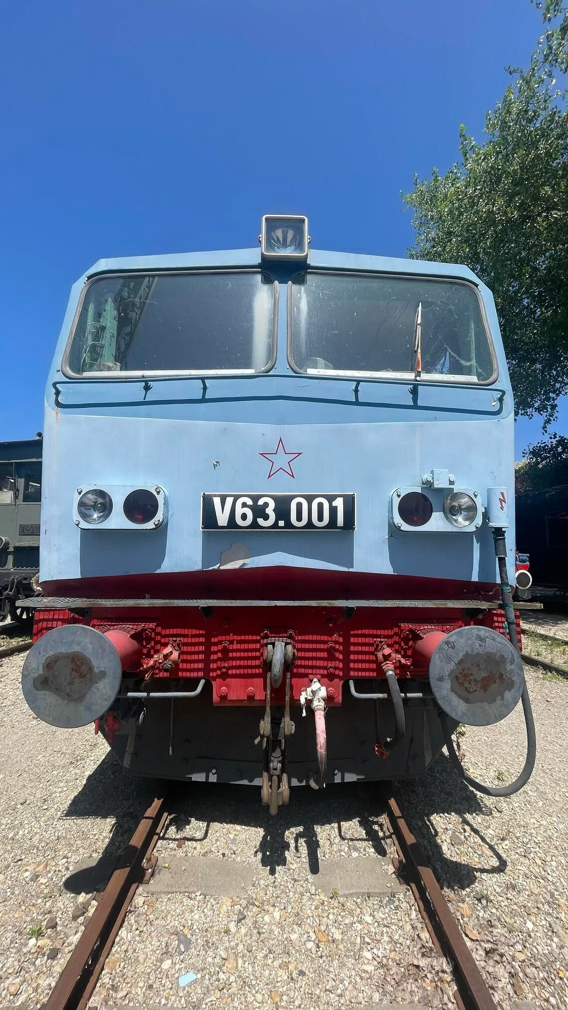 A retro-futuristic 1975 electric locomotive at the Hungarian Railway Museum, with a red star from the country’s socialist period.