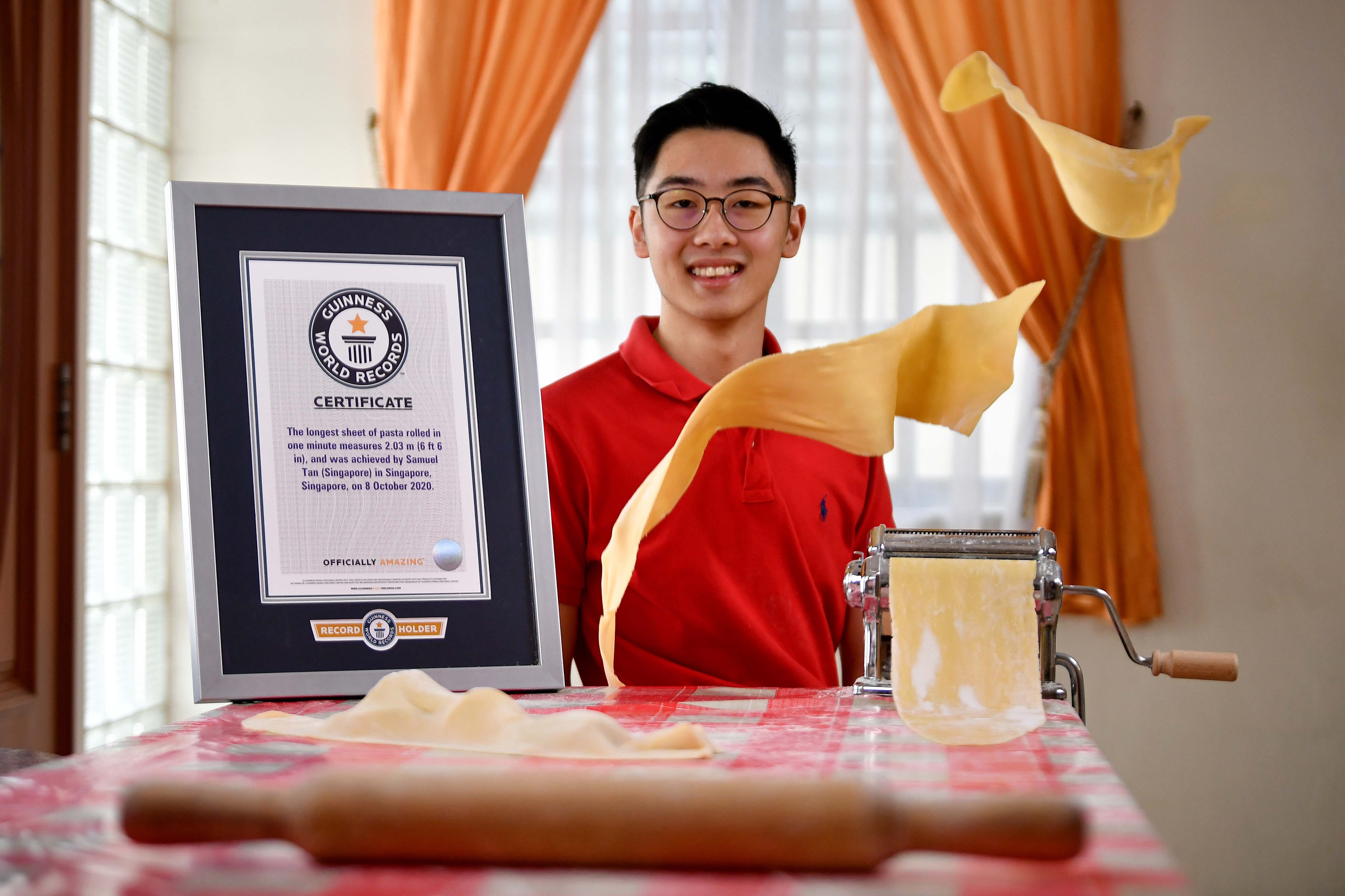 Mr Tan's first attempt yielded a sheet of pasta that was 1.94m long. But he was worried there might have been a slight tear in the dough, which would disqualify him. He hit 2.03m on his second try, smashing the Guinness World Record by more than 50cm.