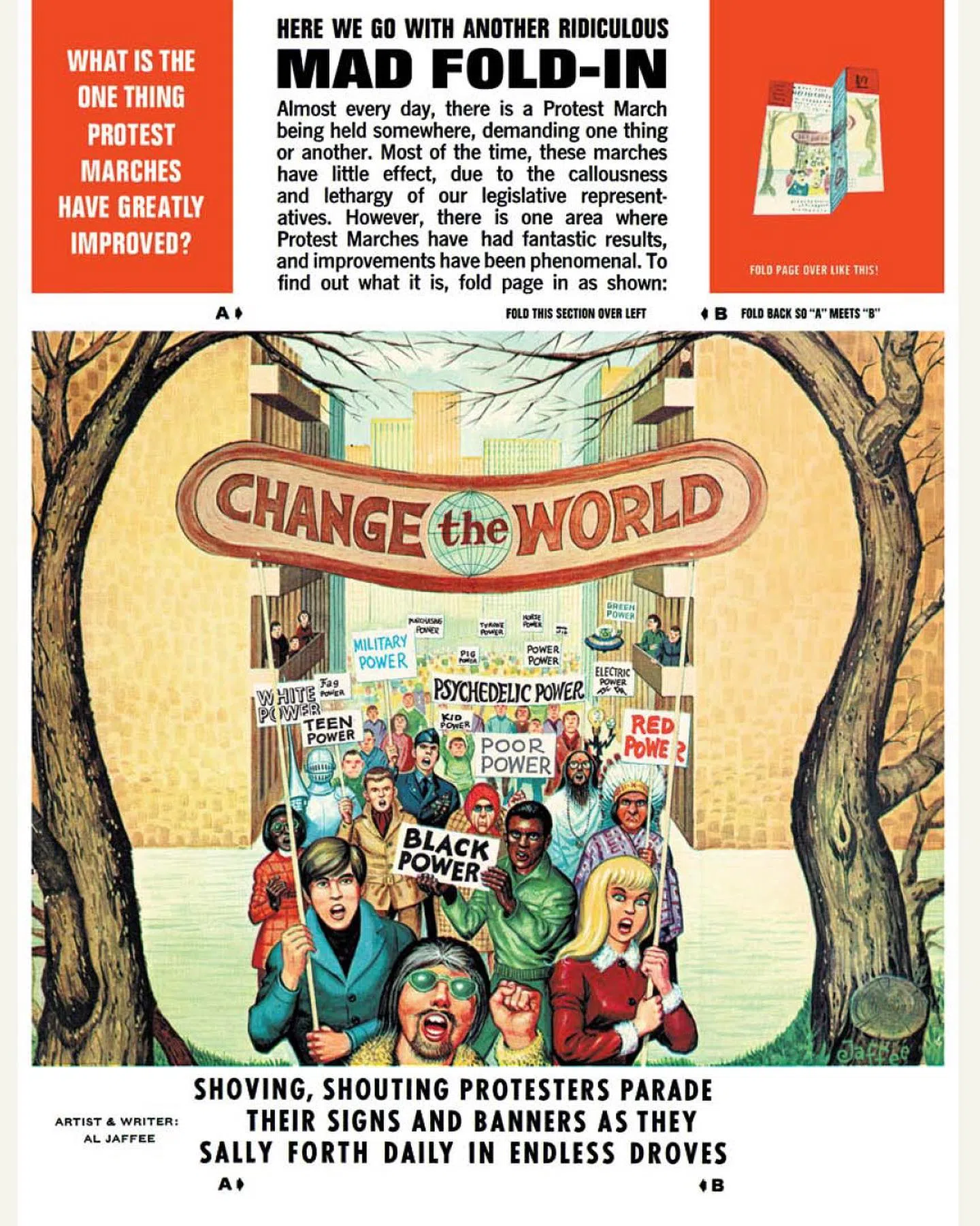 It was in 1964 that Jaffee created the Mad Fold-In, an illustration-with-text feature on the inside of the magazine’s back cover that seemed at first glance to deliver a straightforward message.