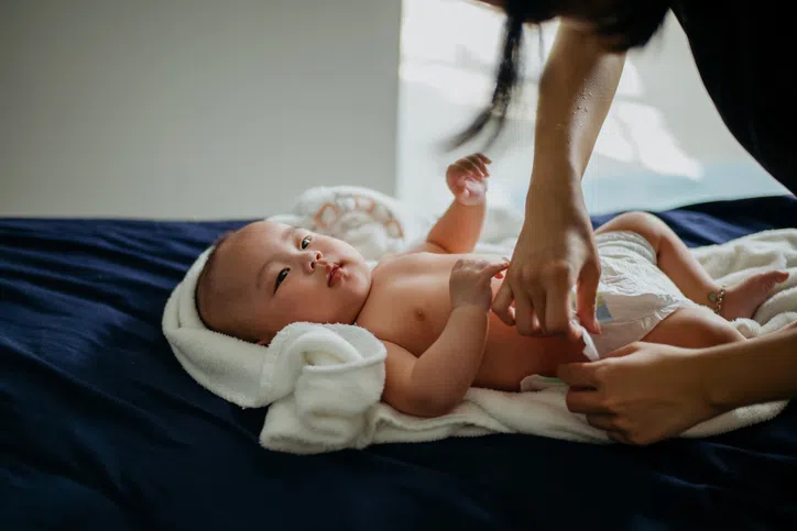 Image of an Asian Chinese woman wearing diaper for her baby boy after bath on bed