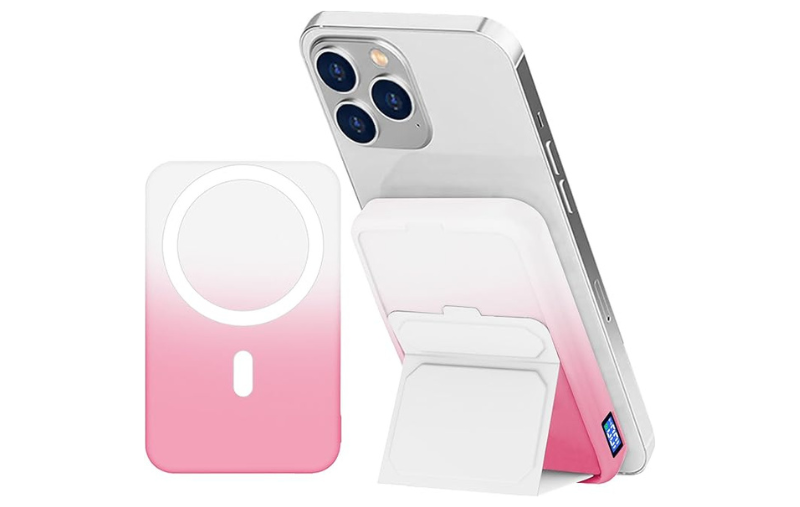 The sleek foldable magnetic Luckyduo Power Bank doubles as a phone holder (for both portrait and landscape screens) and charging source for iPhone 12-15 series. It has an LED display and can charge up to three devices at once.