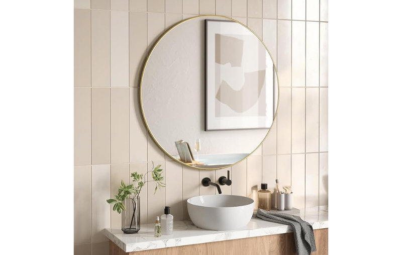 Add a touch of elegance to your home with this trendy round mirror from Umbra. It has a beautiful brass rim finish and helps to effectively brighten up any room.