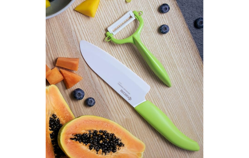 Designed with razor-sharp ceramic blades and ergonomic handles for easy grip, this high-quality knife and peeler set is lightweight, easy to use and rust-resistant thanks to its ceramic material.