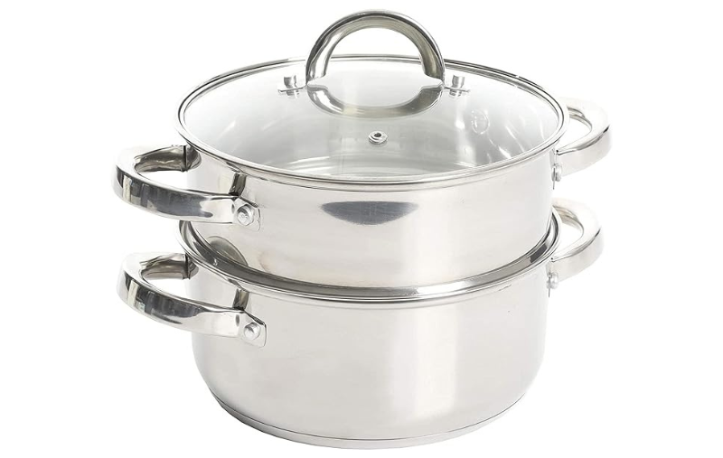 If you’ve been looking for a good steamer set, consider this stovetop set from Oster. With an encapsulated steel base to ensure even heating and cooking, this versatile set also doubles up as a dutch oven.